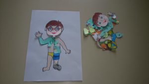 Dajemo vam primer zanimljivog učenja i obnavljanja kategorija odeća i obuća. Na jednom papiru nacrtajte dečaka/devojčicu koji na sebi nema odeću i obuću. Na drugim papirima nacrtajte dečaka/devojčicu koji na sebi ima odeću i obuću i isecite u obliku slagalice. Dete ima zadatak da složi slagalicu. Osim za učenje i obnavljanja odeće i obuće, ova aktivnost je korisna za održavanje pažnje, uočavanje delova i celine, učenje delova tela.