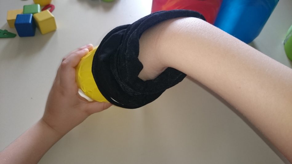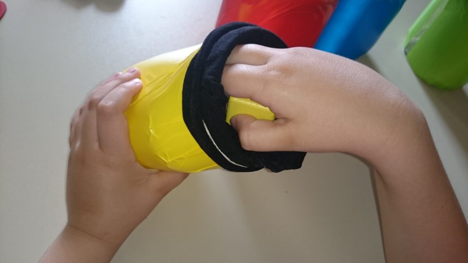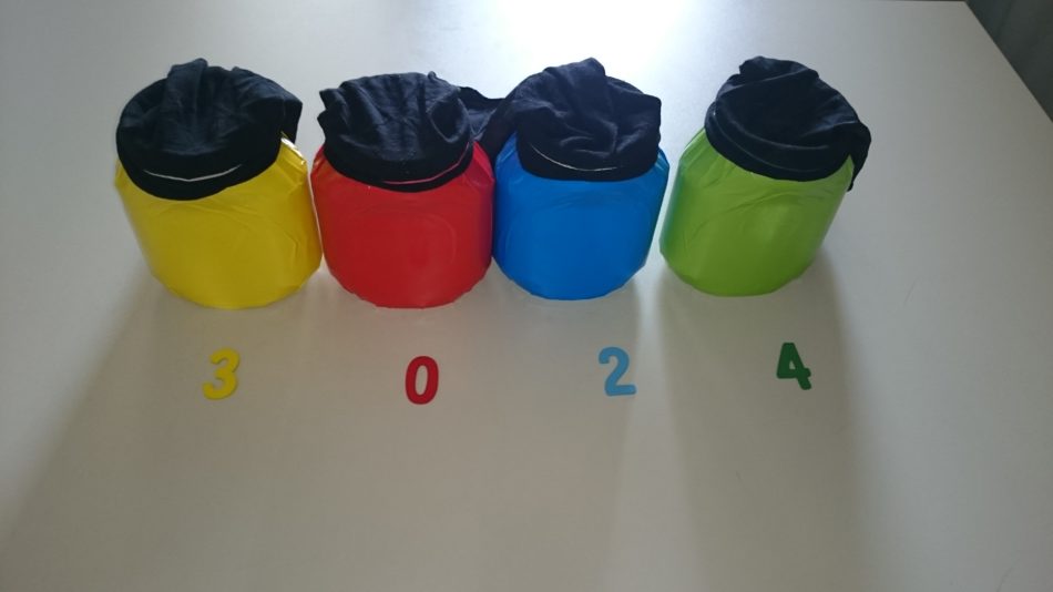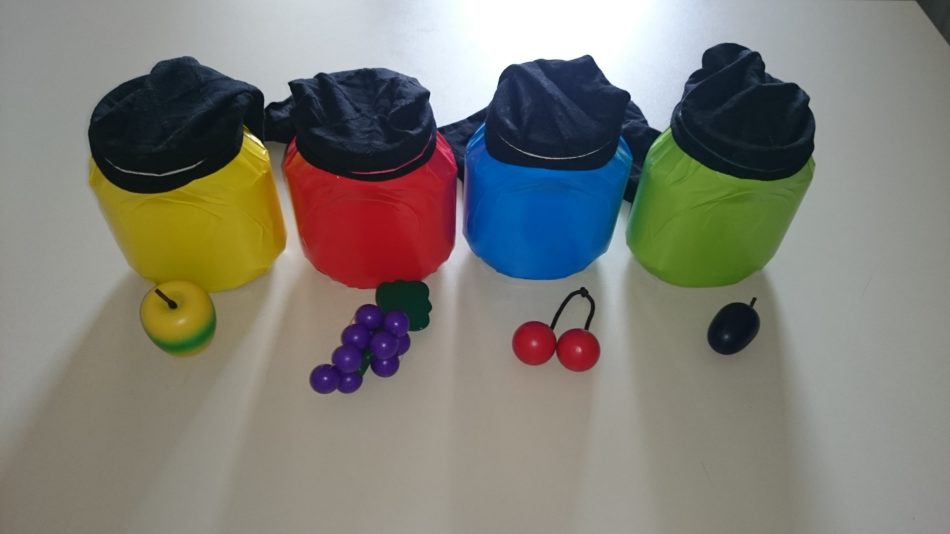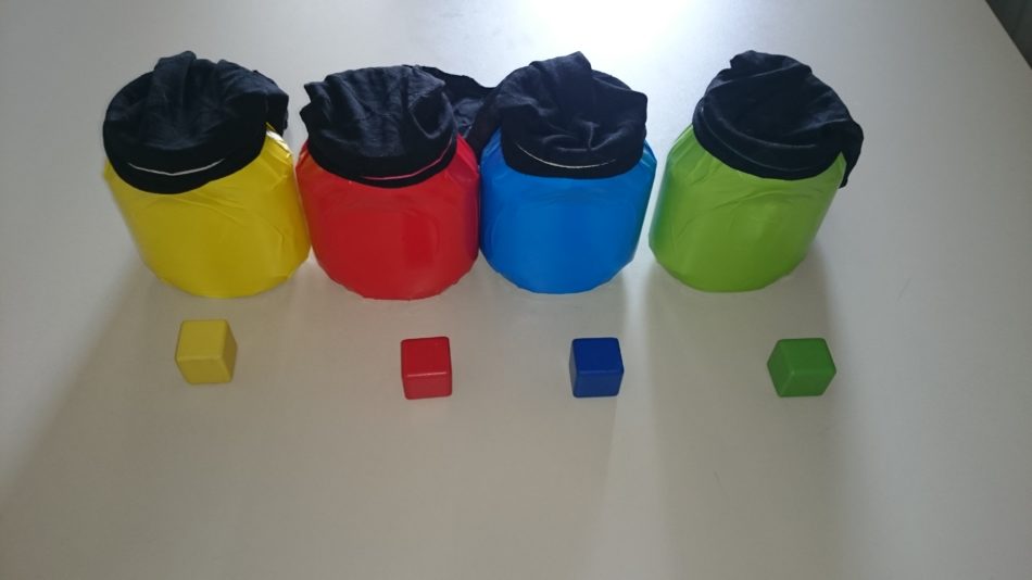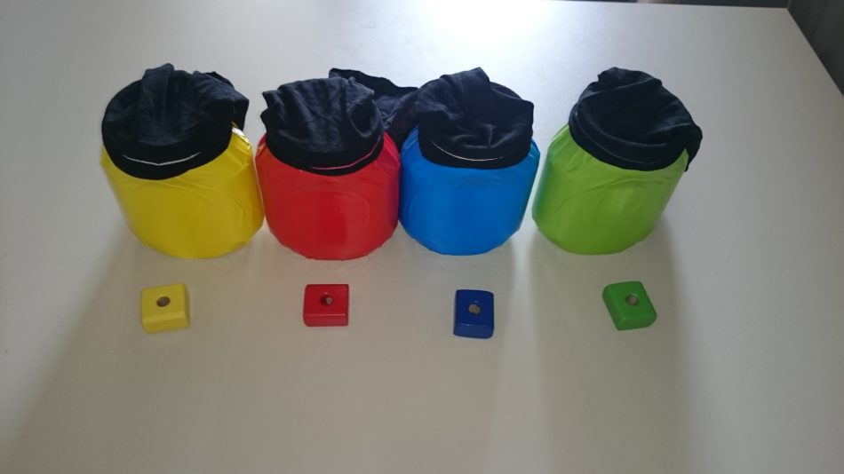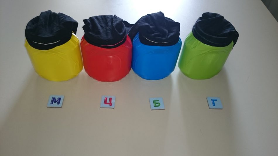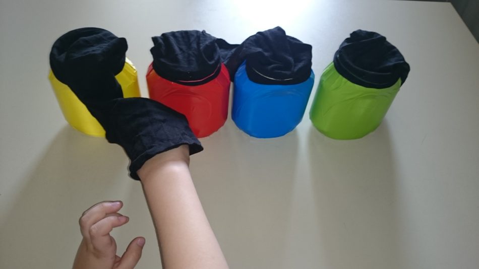 Za ovu aktivnost su vam potrebne tegle (staklene ili plastične), papir u boji (po mogućstvu samolpeljivi kolaž) i čarape. Tegle obložite papirima različite boje da dete ne bi videlo šta se nalazi u njima. Čarape stavite na tegle i pričvrstite ih gumicama. Zadatak može da ima različite varijante. Jedna od njih je da ubacuje različite predmete (različite oblike, kocke, lopte i sl.) u tegle iste boje. Zatim, u tegle možete da sakrijete voće ili neki drugi predmet, a dete ima zadatak da ga izvadi i kaže koje je to voće i da opiše kako izgleda. U tegle možete da sakrijete slova, a dete ima zadatak da izvadi slovo i da kaže koje je slovo u pitanju. Možete da mu postavite pitanje koja reč počinje na slovo koje je pronašao u tegli. Na taj način dete pripremate za analizu i sintezu glasova u reči. Svaki zadatak može da se sastoji od stavljanja predmeta u teglu i vađenja predmeta. Pomoću ove aktivnosti sa mlađim detetom učite pojmove ima/nema.