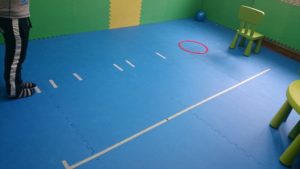 Objasnite detetu da će praviti korake tako što će pratiti papire na podu. Treba da krene sa desnom nogom, a zatim levom. Zatim da skoči u krug, zatvori oči, stoji mirno i broji do pet. Nakon toga, treba da izađe iz kruga i obiđe dva puta oko stolice, ide po zalepljenoj traci sporo (tako da mu peta jedne noge dodiruje prste druge noge) sve do obeleženog mesta flomasterom na traci odakle treba da hoda brzo i stane na obeleženom mestu.