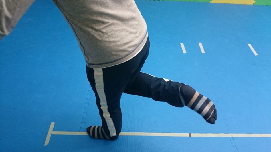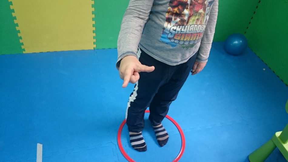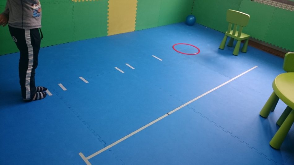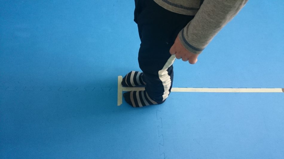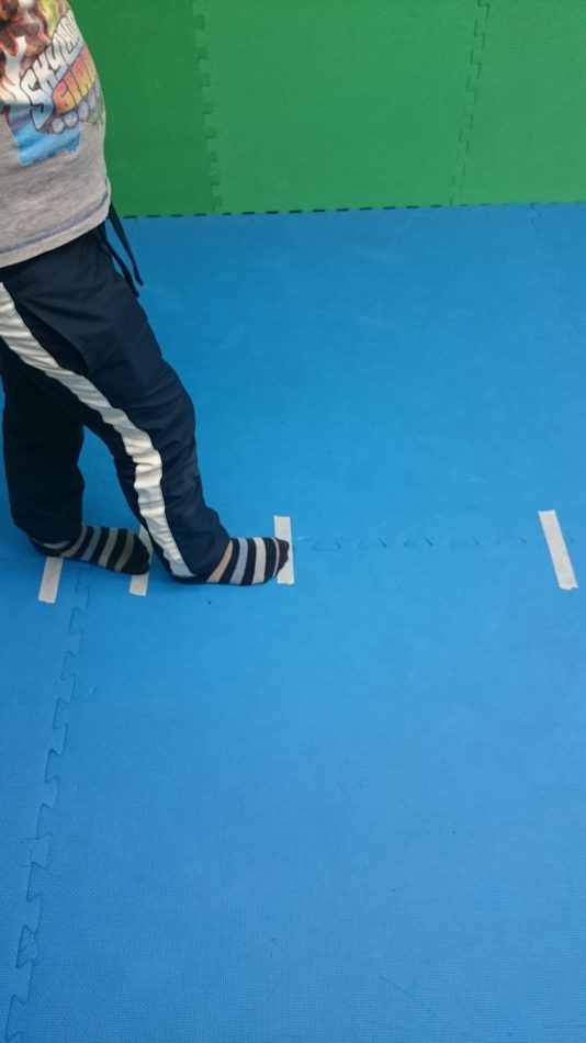 Objasnite detetu da će praviti korake tako što će pratiti papire na podu. Treba da krene sa desnom nogom, a zatim levom. Zatim da skoči u krug, zatvori oči, stoji mirno i broji do pet. Nakon toga, treba da izađe iz kruga i obiđe dva puta oko stolice, ide po zalepljenoj traci sporo (tako da mu peta jedne noge dodiruje prste druge noge) sve do obeleženog mesta flomasterom na traci odakle treba da hoda brzo i stane na obeleženom mestu.