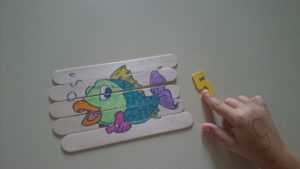 Igračka slagalica (petao, kuća, slon, leptir) koja je delo ruku naših prijatelja iz Kockica Eco Toys. Mlađe dete ima zadatak da složi slagalicu i imenuje pojam, a starijem detetu postavite pitanja čijim će odgovorima bogatiti svoj rečnik. Ovakve ili slične slagalice možete da napravite i u kućnim uslovima tako što ćete nacrtati neki pojam na kartonu ili papiru, a zatim ga iseći na trake ili nepravilne oblike. Isto tako, pojam možete nacrtati i na drvenim štapićima. Slaganje slagalica podstiče razvoj fine motorike, vizuelne percepcije, kooridnacije oko-ruka, usvajanje pojmova deo i celina.