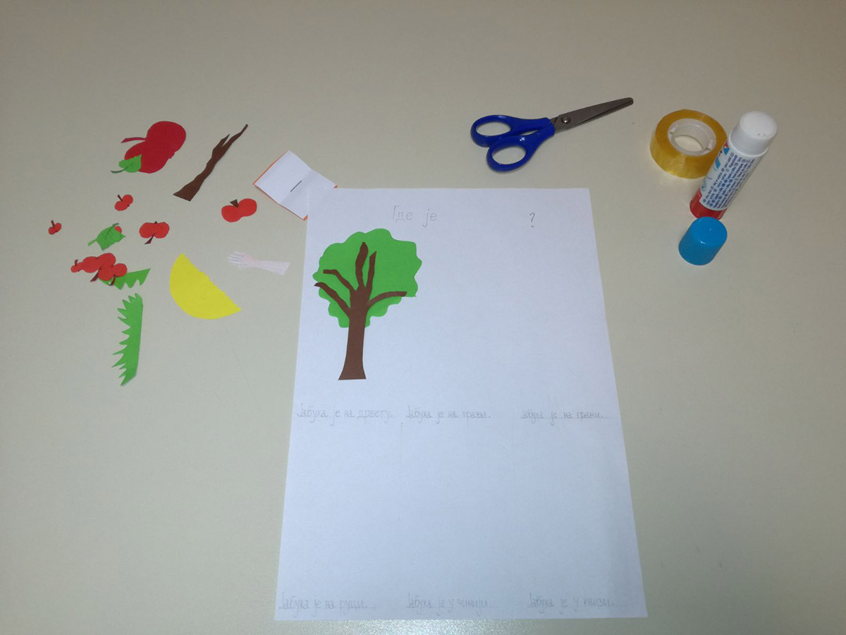 Dete pre polaska u školu treba da usvoji sve predloge (na, u, ispred, iza, iznad, pored, između). Na stranici logopedske sveske koju vam predstavljamo, radi se o tome kako da sa detetom na zanimljiv i slikovit način naučite ili obnovite predloge. Na papiru u boji nacrtajte, potom isecite oblik jabuke, lista ili nekog predmeta po izboru ( sat, ključ,…). Detetov zadatak je da određeni pojam stavi na odgovarajuće mesto. Takođe, od papira u boji napravite i mesta na koja će da stavlja oblike. Dok radite sa detetom, postavljajte mu pitanja gde se šta nalazi.