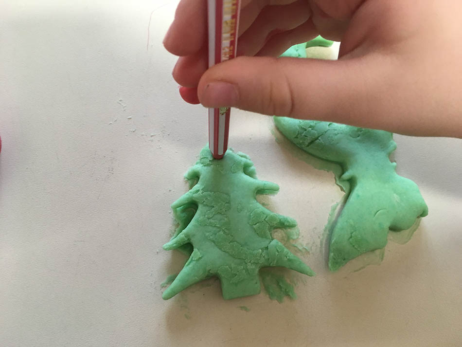 Pomoću oklagije rastanjite testo na stolu, a zatim ga isecite modlama. Na vrhu ukrasa napravite rupicu kroz koju ćete provući konac pomoću koga ćete okačiti ukras na jelku. Svaki ukras ukrasite po želji. Kada ukrasite onako kako želite, ispecite ih. Pečete ih dok ne budu dovoljno tvrdi, ali ne previže da ne bi popucali. Kada ih ispečete možete ih poprskati sprejom koji u sebi ima šljokice ili samo sjaj kako bi ukrasi bili što lepši.